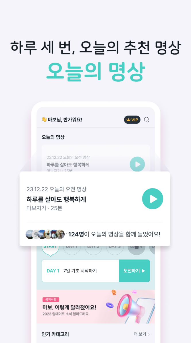 - 데일리 명상: 하루 3분부터 시작하는 짧은 세션.