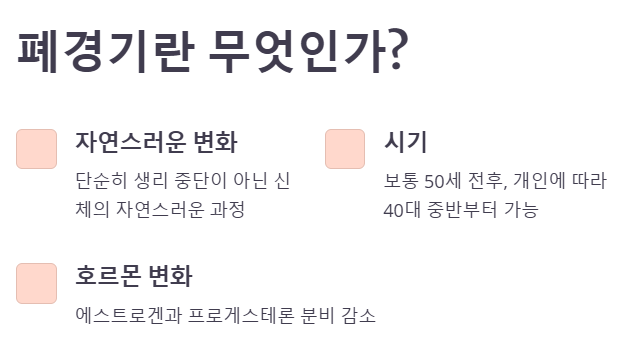 폐경기는 단순히 생리가 멈추는 현상이 아닌, 여성의 몸이 겪는 자연스러운 변화의 시기입니다. 대개 50세 전후에 나타나지만, 개인에 따라 40대 중반부터 시작될 수도 있습니다. 이 시기는 난소의 기능이 점차 감소하면서 여성 호르몬인 에스트로겐과 프로게스테론의 분비가 줄어들어 발생하는 신체적, 정신적 변화의 과정입니다.