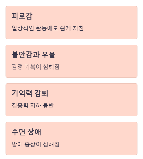피로감, 불안감, 우울, 기억력 감퇴 등의 정신적 증상도 동반될 수 있으며, 특히 밤에 증상이 심해지면 수면 장애로 이어질 수 있습니다. 또한 에스트로겐 부족으로 인한 질 건조 현상은 성생활에 불편함을 가져올 수 있습니다.