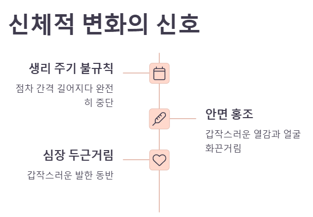 폐경기에 가장 흔하게 나타나는 증상은 생리 주기의 불규칙함입니다. 점차 생리 간격이 길어지다가 결국 완전히 중단됩니다. 우리나라 여성의 약 50%는 안면 홍조, 심장 두근거림, 갑작스러운 발한과 같은 급성 호르몬 결핍 증상을 경험합니다.